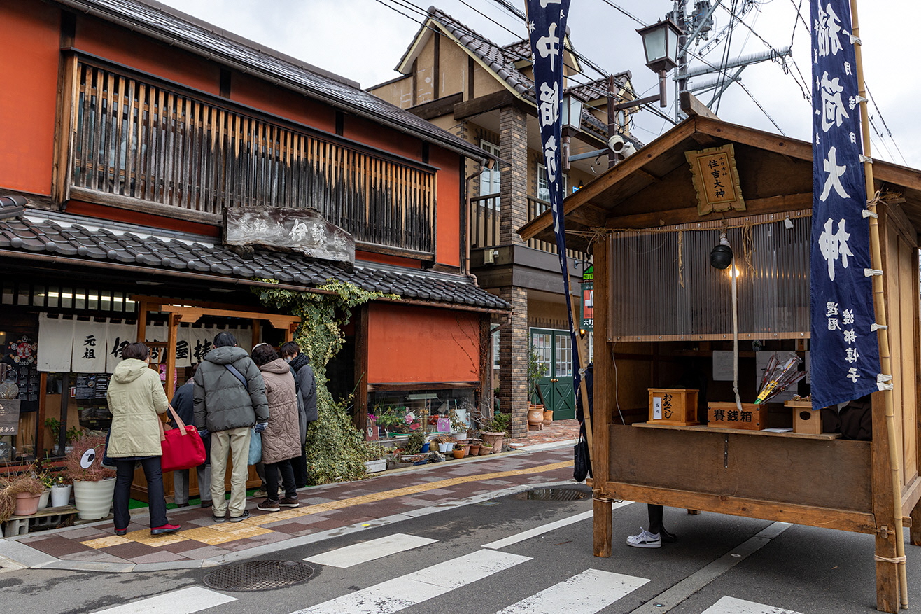 漆器、日用品、玩具、縁起物店、焼そば、たこ焼きなど露店が商店街に延々と軒を連ねます。